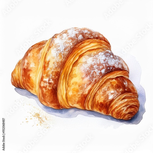 Realistic watercolor hand drawn powdered croissant, isolated on white background. Food Illustration of traditional french breakfast
