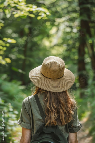 Rear view of a woman with long hair and a straw hat walking in a lush green forest, enjoying nature and tranquility on a sunny day.