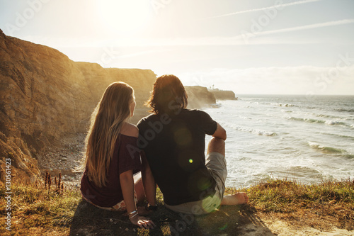 Rear view of couple sitting on cliff and looking at sea