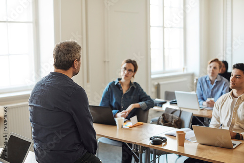 Rear view of male teacher teaching students in classroom