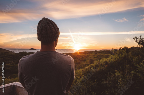 Rear view of man wearing knit hat looking at sea against sky during sunset