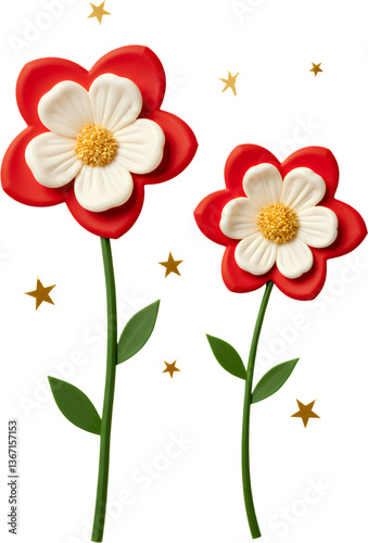 Red & White Flowers, Gold Stars, Transparent Background