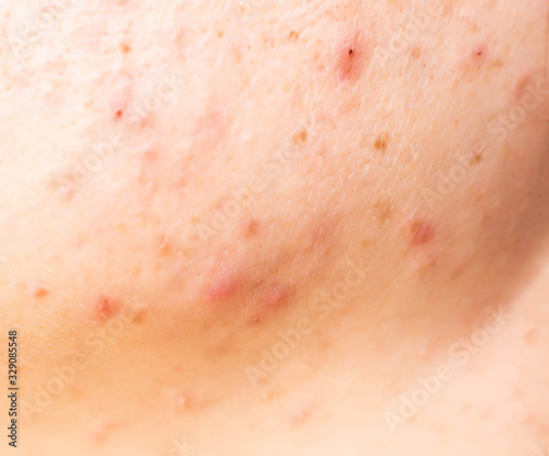Red acne on the girl's face, background, macro