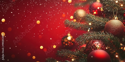 Red and gold Christmas ornaments with pine branches and twinkling lights on a glittery red background