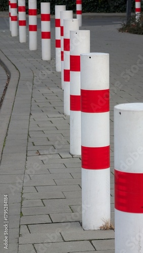 Red and white bollards in city. A series of red and white bollards line the sidewalk in an urban area, creating a clear barrier. The setting appears orderly and well-maintained.