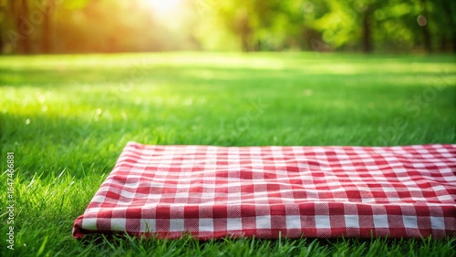 Red and white checkered picnic blanket spread on lush green grass in a sunlit park, perfect for a relaxing outdoor meal