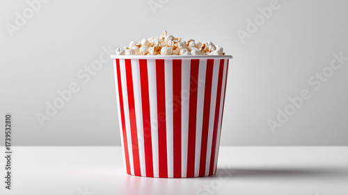 Red and white striped popcorn bucket filled with popped corn