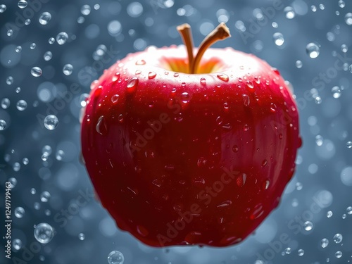 Red apple with scattered water droplets reflecting light and creating a beautiful shimmering effect, water droplets, reflective, sphere