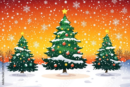 Red background, Christmas trees in the snow with falling snowflakes, vector illustration style, simple and cute design, simple background