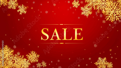 Red banner with "SALE" in bold gold letters at the center. Golden snowflakes of various sizes decorate the corners and edges, creating a festive atmosphere