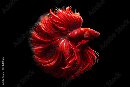 Red Betta fish with majestic fins. Vivid red Betta fish with long, majestic fins against a black backdrop, highlighting its vibrant coloration and elegant movement.