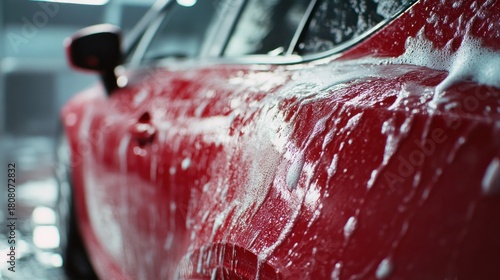 Red car covered in soapy foam during car wash.
