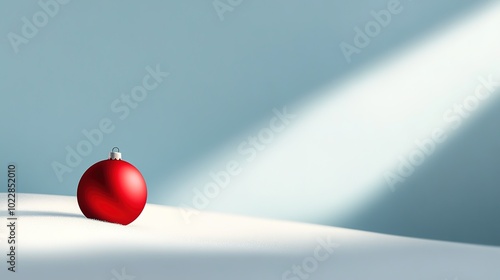 Red Christmas ornament in snow with sun rays