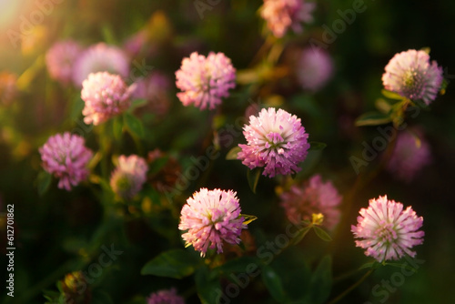 Red clover flower Trifolium pratense close-up, in a meadow of clover and wild herbs, in natural soft sunset sunlight.