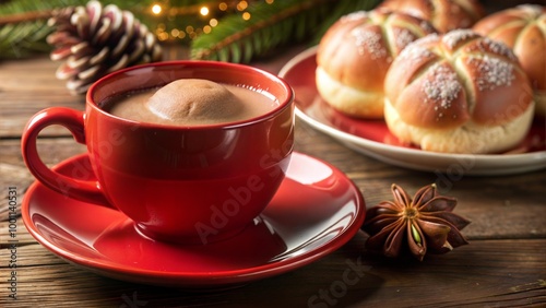 Red cup of hot chocolate with sweet buns on plate, decorated with Christmas elements