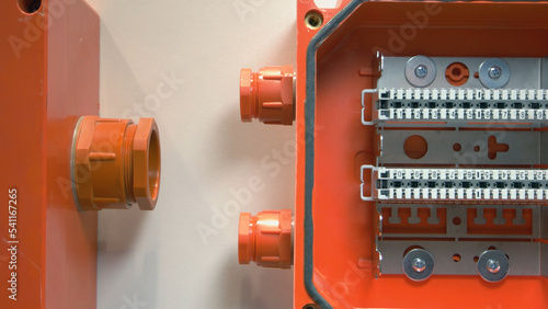 Red electric control box on white background. Industrial fuse box. Blur and focus.