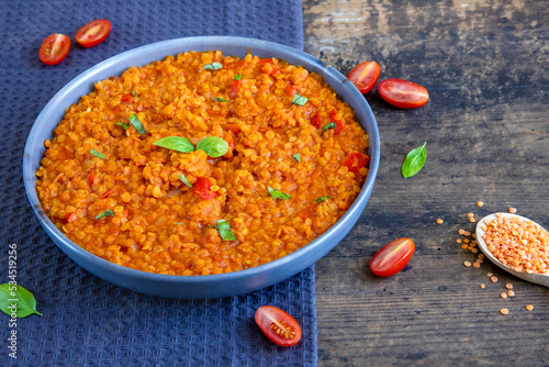 Red lentil dish with tomatoes and peppers. Vegetarian cooking