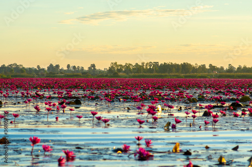 Red lotus lake at sunrise in the morning time.Udon-thani Thailand.