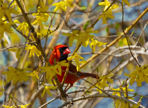 Red male northern cardinal bird among yellow forsythia flowers in spring