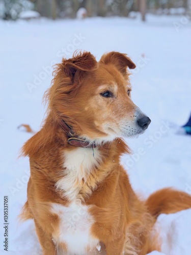 Red Mixed Breed Dog, Wearing a Leather Collar, Sitting Outside in the Snow.