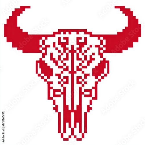 Red Pixelated Bull Skull with Intricate Pattern on White Background
