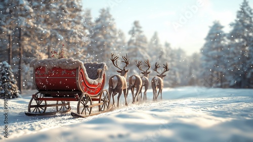 Red Sleigh Pulled by Reindeer in Winter Wonderland