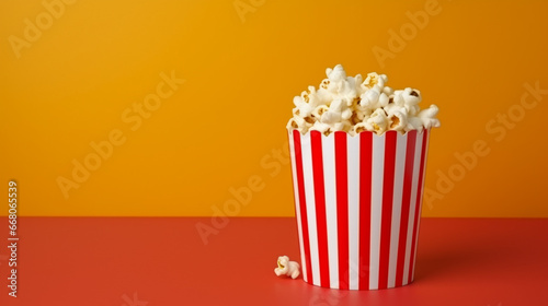 Red striped box of popcorn in the cinema background. Evening watching a movie or TV