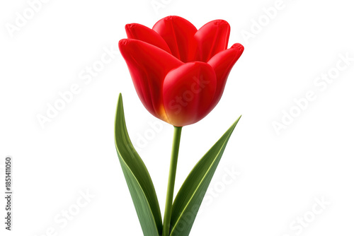 Red tulip blooming, showing vibrant color petals, green stem, and leaves, isolated on a transparent background