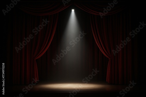 Red velvet theater curtain parted with bright spotlight cone dramatic scene classic ambiance