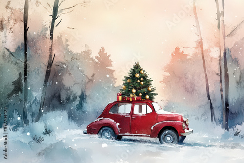 Red vintage car is driving through snowy woods with a christmas tree strapped to its roof
