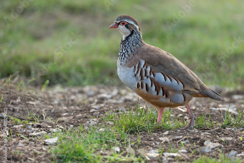 Red-Legged Partridge in the wild. Scientific name: Alectoris rufa. Close up of an alert red-legged or French partridge in natural agricultural field habitat. Facing left. Horizontal. Copy space