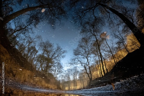 Reflected forest at twilight, starry sky