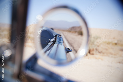 Reflection of desert highway in a car wing mirror