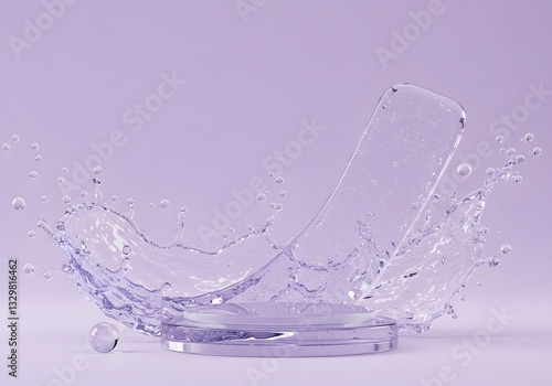 Refreshing 3D Cosmetics Concept: Glass Podium and Water Splash on Baby Purple Background for Product Display or Banner