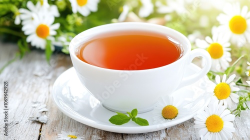 Refreshing Chamomile Tea with Fresh Daisies on Rustic Wooden Table