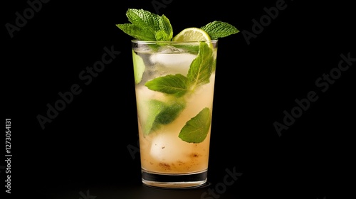 Refreshing cocktail with mint and lime served in a clear glass on a dark background