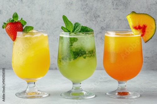 Refreshing cocktails in clear glasses showcasing vibrant colors and garnishes at a summer gathering