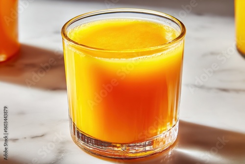 Refreshing Cold Glass of Bright Orange Mango Juice with Smooth Texture and Vibrant Color in a Clear Drinking Glass on Marble Surface