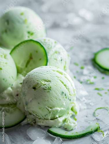 Refreshing cucumber and lime ice cream, a closeup of refreshing cucumber and lime ice cream, its light green color and zesty lime flavor highlighted against a white background