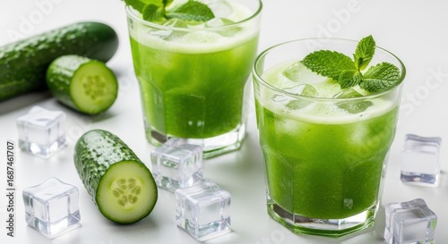 Refreshing Cucumber Mint Iced Drinks with Ice Cubes and Fresh Mint Garnish