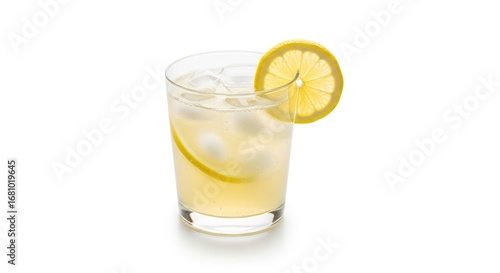 Refreshing glass of classic lemonade with ice cubes and a fresh lemon slice, isolated on a clean white background. Perfect summer drink.