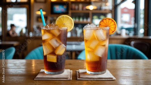 Refreshing Iced Tea Duo in a Cozy Cafe with Empty Space for Text Ideal for Summertime Drink Promotions and Beverage Advertising