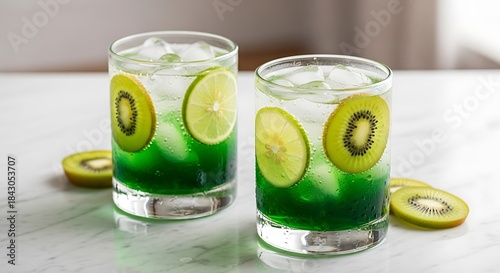 Refreshing Kiwi and Lime Cocktail Drinks with Ice Cubes.