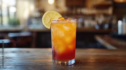 Refreshing lemon iced tea served in a glass with ice on a rustic wooden table in a cozy cafe setting