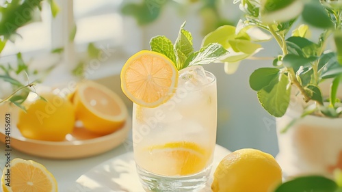 Refreshing Lemonade Drink with Lemon and Mint in Sunlight