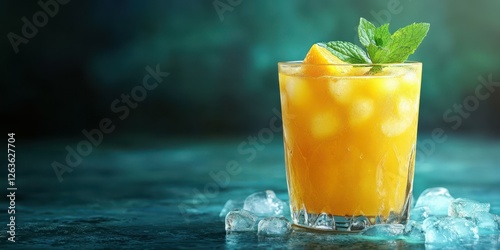 Refreshing mango beverage served over ice with mint leaves on a cool surface