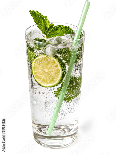 Refreshing Mojito cocktail in a tall clear glass filled with crushed ice, sparkling water, lime wedges and fresh mint leaves.
