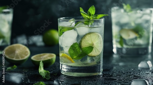 Refreshing mojito cocktail with lime and mint garnished with ice in a cool, moody setting