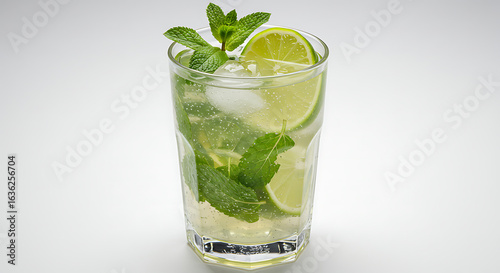 Refreshing Mojito Cocktail with Lime and Mint Sprigs on White Background, Perfect for Summer Celebration and Tropical Refreshment