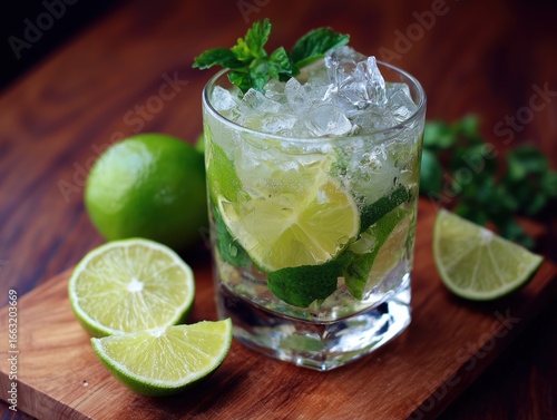 Refreshing mojito with lime and mint served over ice on a wooden surface